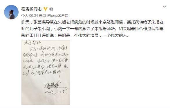 朱旭去世,张艺谋写下亲笔信:他永远是我们学习的榜样!
