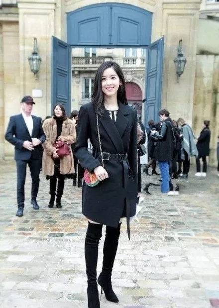 黑色西装大衣利落又大气,用腰带来打造出腰线,显高又显身材。中长的款式搭配一双黑色长筒靴,适当露腿性感万分,又显得腿长腿细,整套穿搭即使都是低调的黑色也一样气场很足。