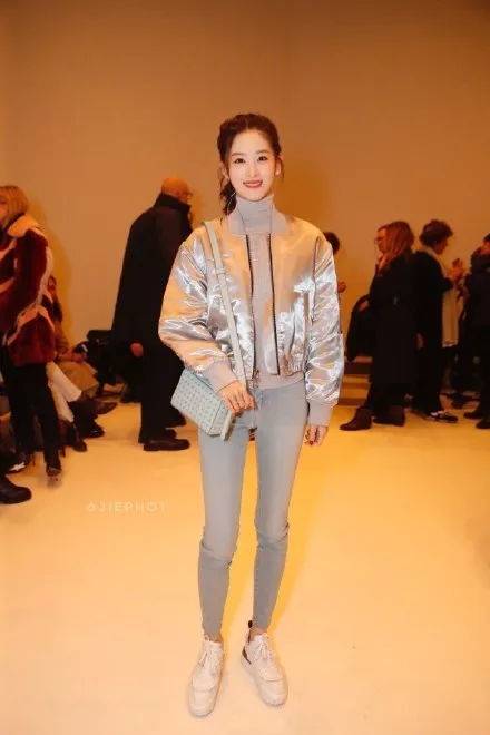 浅色高领毛衣搭配浅色修身牛仔裤,时尚又高级,外搭一件短款银光棒球夹克,前卫又潮流,整套穿搭大牌感十足,又高级又有范儿。