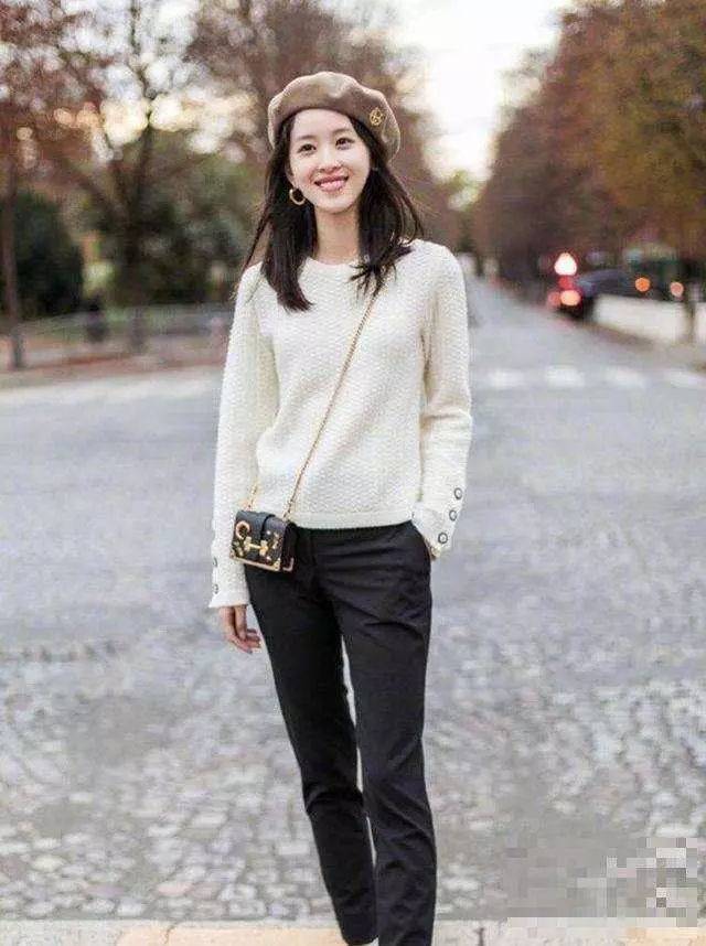 简单的白色毛衣搭配黑色休闲裤,很简约舒服的一套穿搭。白色毛衣温柔甜美,袖口的扣子设计为毛衣增加了时髦。贝雷帽为整套穿搭添加了时尚度,时尚又气质。