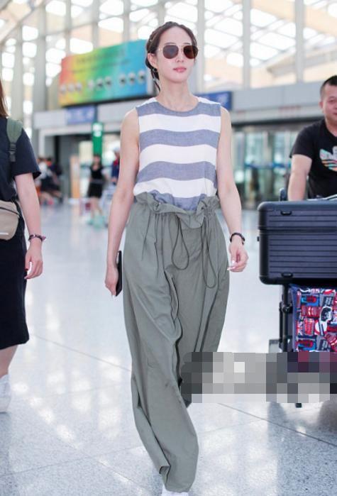 看多了活动照,接下来看一张机场照。这一张照片里面的张钧甯不再是知性的感觉,反倒像是一个邻家小妹妹的的感觉,上面穿着白色与灰色的条纹上衣,上衣是横条纹的款式,看上去会有小清新的感觉,宽松的长裤是高腰的设计,会显腿长。