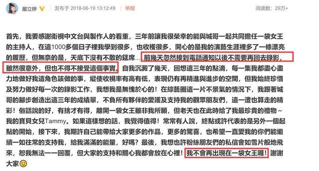 没过多久,严立婷在社交网站上发长文表示,自己已经接到节目组的电话通知,以后不用再回去录制了!对于节目组要她全面交出节目主持棒的决定,严立婷觉得十分意外,但是还是接受现实,尊重节目组的决定。