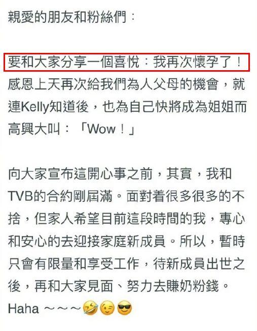 结婚之后,钟嘉欣渐渐淡出荧屏,回归家庭当起好妈妈好太太。而今年三月,钟嘉欣又宣布自己怀上了二胎。