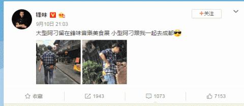 在9月10晚,谢霆锋也发微博分享图片,并配文:“大型阿刁留在鋒味音樂美食展 小型阿刁跟我一起去成都!”证实网友偶遇属实。