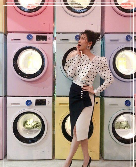 年轻时的贾静雯真是肤白貌美,能够轻松的驾驭住不同风格的服装。白色的波点衬衫搭配上黑白配色半身裙,虽然款式看起来有些夸张,可是穿在贾静雯的身上却是十分的优雅温婉。