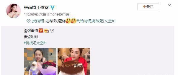 张雨绮的工作室随后转发了张雨绮的微博,并评论,“地球欢迎你”。然而张雨绮的两张照片对应着“重返地球”“挑战吧太空”这样的主题,对于张雨绮疑似参加新节目的情况,粉丝们都显得很激动,表示期待。