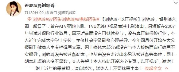 还是她姐姐突然和她说,想不到你在娱乐圈的日子那么凄惨,这让刘锦玲一头雾水,后来她上网搜索自己的资料,看到这些不实传闻感到很气愤。媒体添油加醋的不实报道给她造成了困扰的,刘锦玲一直积极寻找解决之道。如果打官司或者回香港召开记者会,都需要时间和金钱,而她忙着读书和实习,所以没有时间也没有精力去追究。