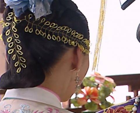 第二个后脑勺的风景:这位女子的打扮比较特别,后脑勺被蓝色花朵和两条黄金花枝给占去了篇幅,花枝正好蔓延到了燕尾上、耳鬓上,别具一格。