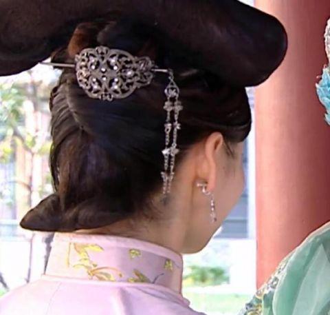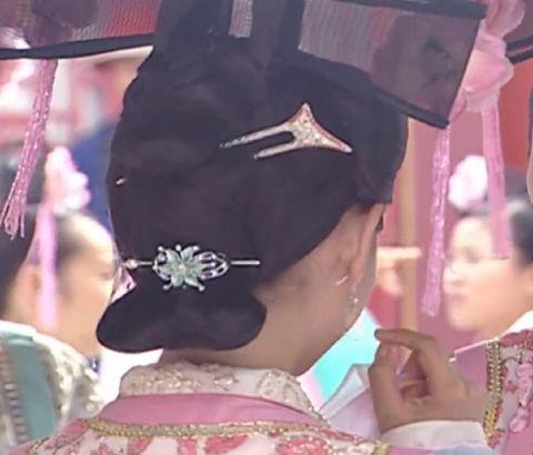 第六个后脑勺的风景:这位女子打扮得像民间女子,但她其实是宫里的娘娘哦。她的头部背后戴了一对粉色水晶的插梳,然后还有粉色的花枝条蔓延到头顶,再蔓延到前面。