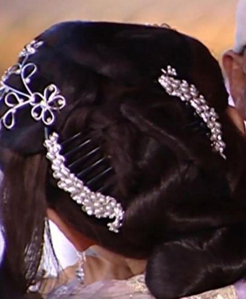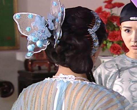 第三个后脑勺的风景:这位女子没有扎满清发式燕尾,而是梳起了麻花辫,然后戴了一顶透明的蕾丝钿子,再在鬓边别上几只蓝蝴蝶,一眼就能看出她是谁哦。
