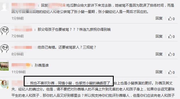 整件事情发生之后,似乎偏向张小斐的人更多一些,更有的网友坦言说孙茜就是在耍大牌,如果演对手戏的是孙俪,章子怡,看她还要不要去修改剧本,言外之意就是因为张小斐的地位还不够,所以孙茜耍大牌,这次的事件虽然是张小斐没有晋级,但是却赢得了人心,甚至有的网友因为这事纷纷的在孙茜微博下评论,都是吐槽她的言辞,她也因此发文去回应网友谩骂。这些话骂的真是难听,连家父幼子都不放过,这也引得孙茜在昨日(10月2日)不得不作出“反击”,可即使是在孙茜“反击”后,网友也并没有一遍倒的同情她,虽然辱骂亲人的做法的确不对,但网友们似乎依然有不喜欢她的理由,而同情张小斐的仍有不少。