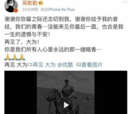 本来在导演之路有着更好发展的李大为却在今年的4月份因为患胆管癌不幸离世,得知此消息的蒋勤勤也是非常的难过,接连发了两条消息悼念前男友,并感谢他曾给予自己的美好青春回忆。