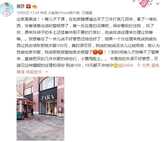 10月8日,邓莎微博发长文讲述在zara购物的经历,并晒出在Zara购物的照片,气愤表示:这是家黑店!知名女星买衣服被误认为小偷,被逼付款,而后怒将小票甩经理脸上