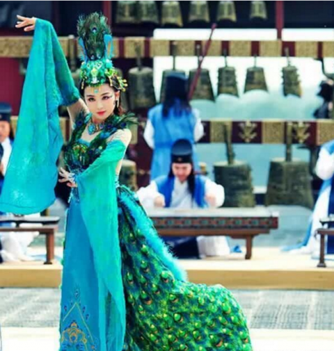 孙俪在《芈月传》中也曾穿上孔雀装献舞,娘娘的舞姿可谓是顾盼生辉了。衣服仿制了孔雀羽毛的花型,配以紫色为主色,看上去女人味十足,头顶的绿色羽毛装饰与黄色绒毛看上去质感也很好,整体造型与利剑形成鲜明的对比,凸显出芈月刚毅又不失柔美的一面,怪不得剧中男主纷纷为芈月所着迷呢。