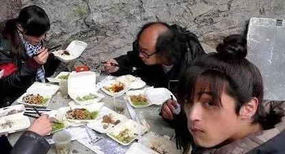 这张图是剧组成员在一起吃饭的照片,在当时剧组的条件似乎也十分的简陋,所吃的饭食看起来也很是简单,尽管如此,演员们劳累了一天对于有这样的快餐盒饭也是非常幸福的一件事情吧,而胡歌的这个表情也是萌呆了。