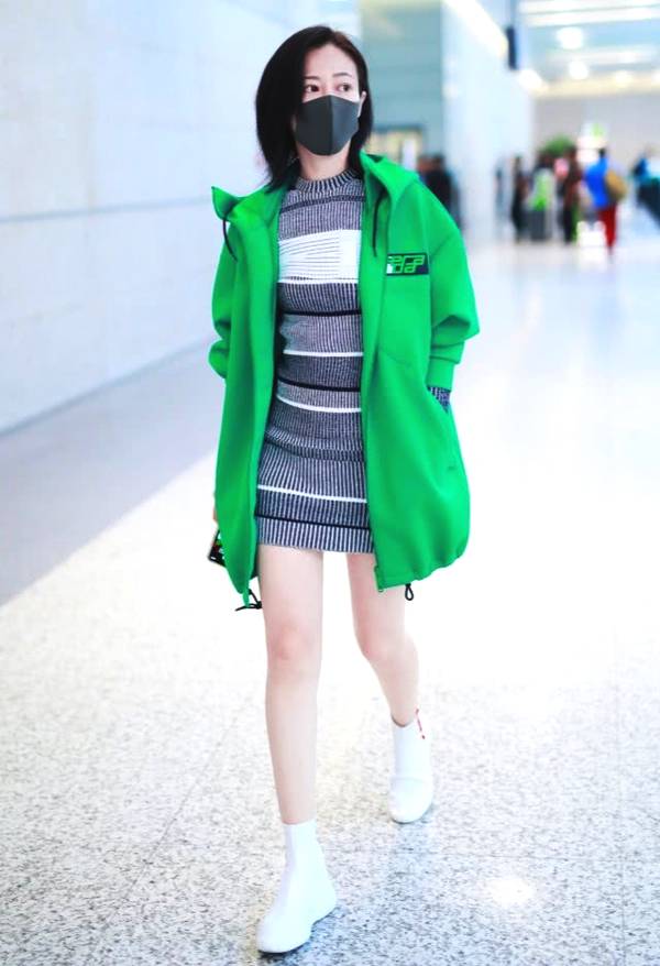 谭卓身穿一件黑白色款内搭,外搭一件绿色宽松款外套,玩起下身失踪,直接搭配一双小白鞋,这大长腿又细又白,人群中一定一眼就能看到。而且满满青春范儿的绿色,秒变元气少女。