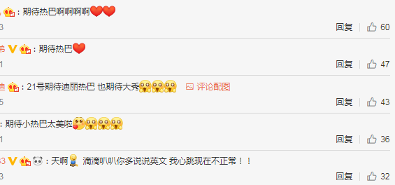 因此,不少网友留言说:好期待热巴,还有网友说:热巴你要多说英文,我心跳现在不正。哈哈哈,看来粉丝已经被爱豆的魅力给深深折服。