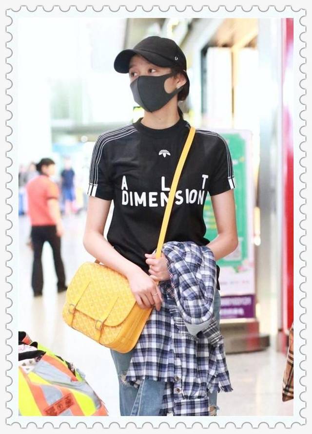 整体穿搭的色彩比较暗沉,可是关晓彤却背了一款黄色的包包,和衣服颜色有着很大的反差,给人以视觉上的冲击,让造型变得更加亮眼。