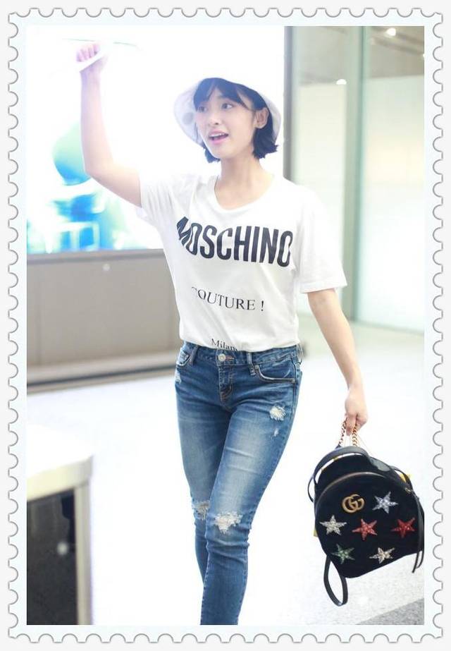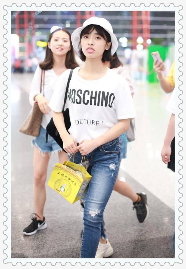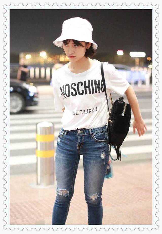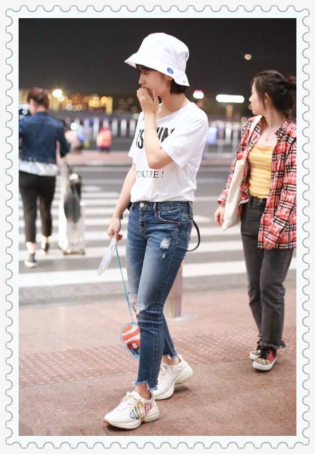 上半身穿了一件白色的T恤,戴上一顶白色的渔夫帽,非常可爱减龄,看起来简直就像是小学生一样,如果不是挑错了牛仔裤,暴露了身材缺陷,那就更好了。