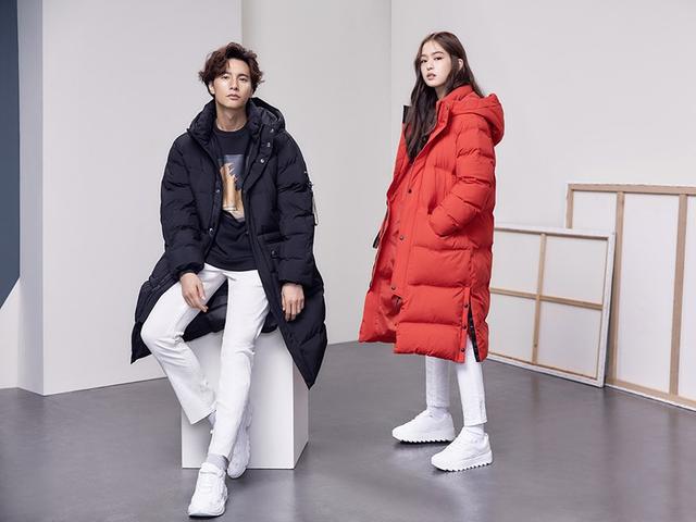 羽绒服也是女生在冬季天天会穿的保暖型外套,这样和男士羽绒服就能组合成情侣装了。看元彬一身黑色羽绒服,内搭黑色圆领卫衣,下身一条白色休闲裤,造型简约自然。