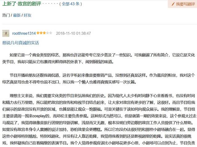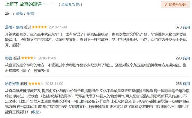 尽管争议和圈层属性明显,这部复合属性的综艺节目还是拿到了8.3分的豆瓣评分,有趣的是,短评最高赞排名前几条是好评,而长评的最高赞第一条则是差评。多是以故宫粉的身份表达了对形式僵硬、内容不丰满的失望。