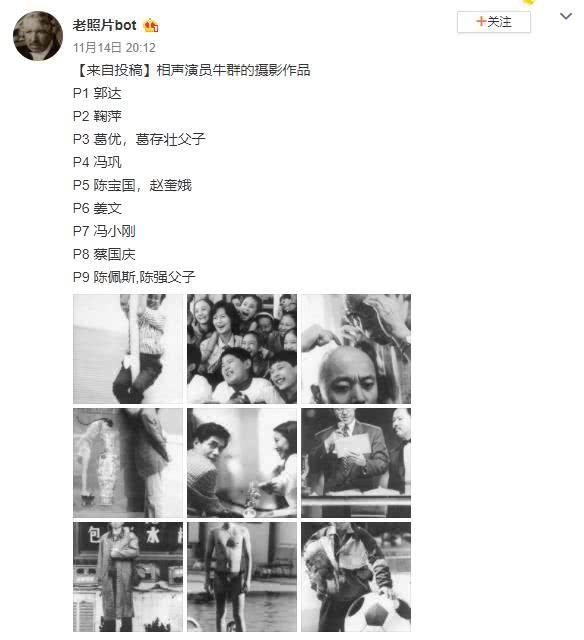 近日,有网友向摄影博主“老照片bot”投稿了一组牛群的摄影作品,让不少人惊悉:这位相声大师居然还是一名摄影高手!而且,葛优、姜文、冯巩、冯小刚、蔡国庆、陈佩斯等都成为牛群镜头下的人物,照片十分珍贵!