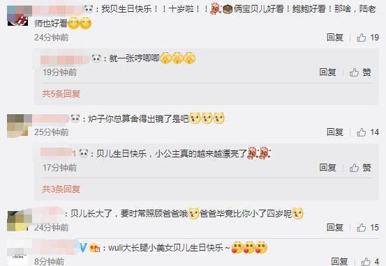 网友看后也纷纷留言:“我贝生日快乐!!十岁啦!!俩宝贝儿好看!鲍鲍好看!那啥,陆老师也好看”、“贝儿生日快乐,小公主真的越来越漂亮了”、“贝儿长大了,要时常照顾爸爸哦爸爸毕竟比你小了四岁呢”、“wuli大长腿小美女贝儿生日快乐”。