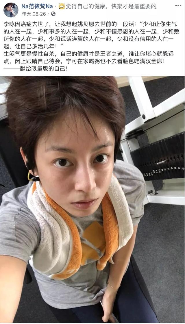 随着李咏因为癌症在美国去世,同样饱受折磨的范筱梵也有感而发,称自己的健康快乐才是最重要的,自己更是独一无二的,并意有所指的表示为了健康,少和让你生气的人在一起,如果谁让你堵心就躲远点,让自己多活几年!