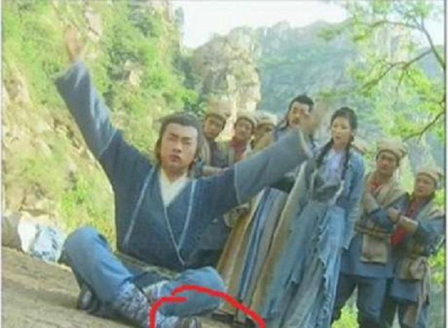 再说一个非常有意思的穿帮镜头,那就是苏有朋版,当灭绝师太打了张无忌一巴掌的时候,我们可以看到苏有朋往后退了好几步,但是当镜头切换到他的脚部时,我却看到一双华丽丽的凉鞋!