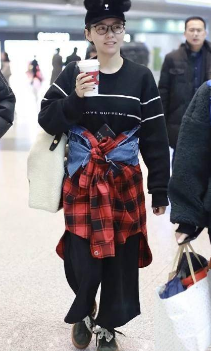 张靓颖身穿黑色针织衫下搭阔腿裤,戴着可爱的卡通帽,显得俏皮可爱。不过这格纹衬衫和牛仔外套搅合在一起系在腰间,这样的造型太浮夸了。脚上的一双大号胶鞋也是土气十足。