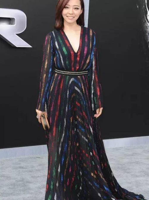 张靓颖一袭黑色的条纹长裙,V字领的设计和拖地裙摆增加了长裙的层次度,细带束腰拉长身材比例,整个搭配质感有余却不失高贵优雅的女人味。