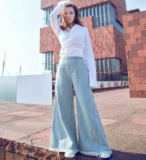 白色衬衫搭配破洞浅色阔腿裤,尽显一双大长腿,完美的身材比例突显女神气质,随性中流露出清新利落的时尚感。脚上的小白鞋更是增添清新与活力,魅力又吸睛。