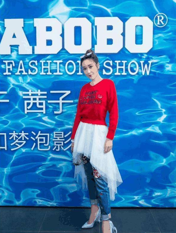 红色套头毛线衣十分显白,衣边点缀一圈网纱面料充满甜美气质,下身穿着蓝色印花牛仔裤搭配白色尖头高跟鞋简单又时髦。