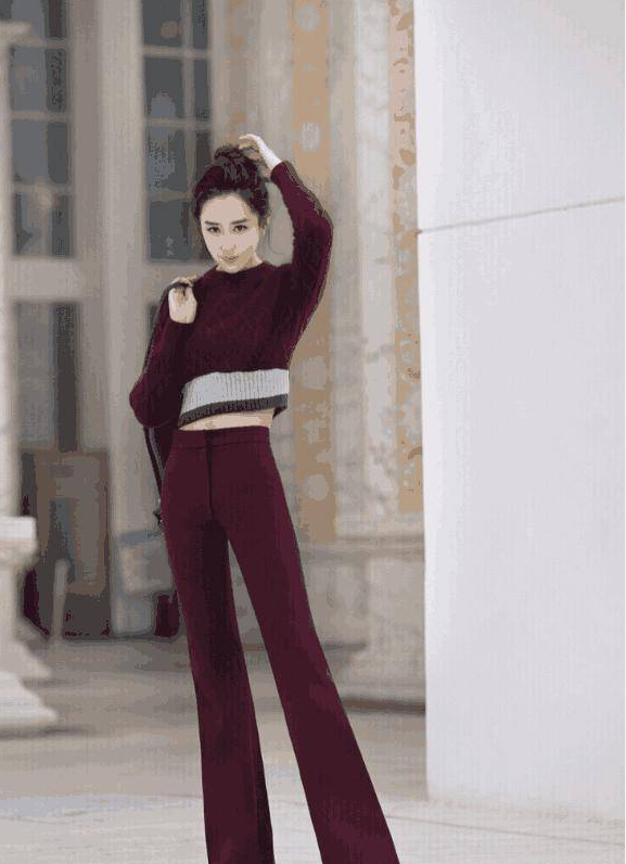 紫色格纹毛衣低调优雅,衣摆点缀一圈蓝色条纹充满活力,下身穿着紫色阔腿长裤搭配黑色高跟鞋修饰出腿部修长的线条。