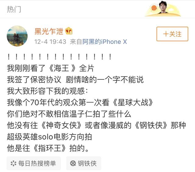 另外,国内的一些电影人在看过《海王》之后,纷纷给出了自己的超高评价。有电影人甚至表示自己像个70年代的观众第一次看《星球大战》时的场景。