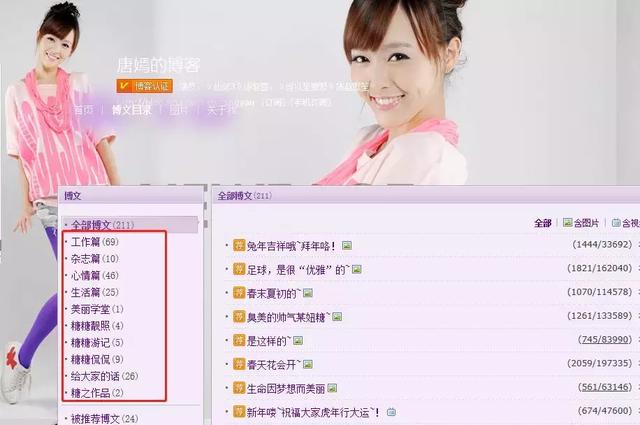 唐嫣的博客写的“最勤快”,她还把内容分了类,工作、生活、心情、杂志.......一边记录工作内容一边写心情和发生的事,还不忘和粉丝互动。