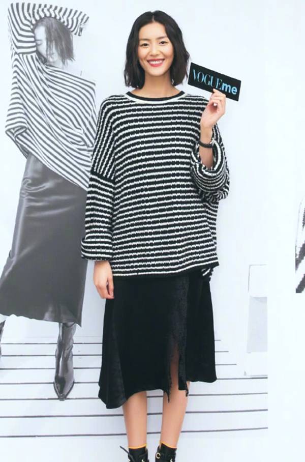 这套淑女风的穿搭,刘雯驾驭起来也是很有魅力的,看看她上半身穿着一件黑白条纹的毛衣,很显清纯少女的气息,下搭一条黑色的半身裙,裙摆还增加了开叉的设计,多了几分俏皮的感觉,原来超模也有可爱的一面!