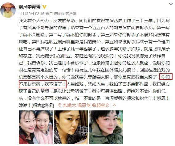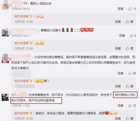 在这之中还有一个制片人,也替她说话,反击封杀她的留言,也是直言支持李菁菁,不会妥协,作为您经纪人的朋友。我会支持您,并且我代表我所认识的朋友,也表示不会找这种导演。之前就表示不会妥协副导演的李菁菁,也是回应这位制片人,谢谢您!我也会配合,并且只要有需要我的地方尽管联系小陶,感恩!