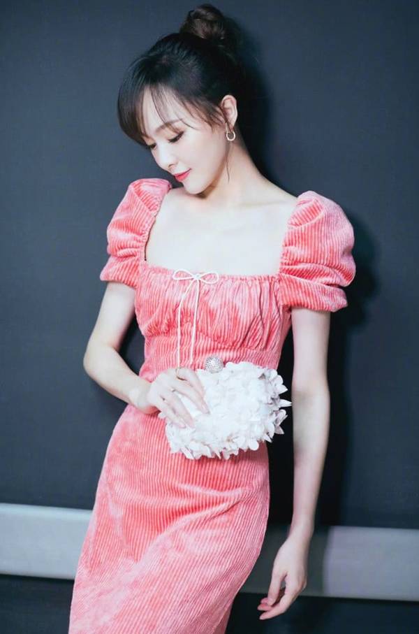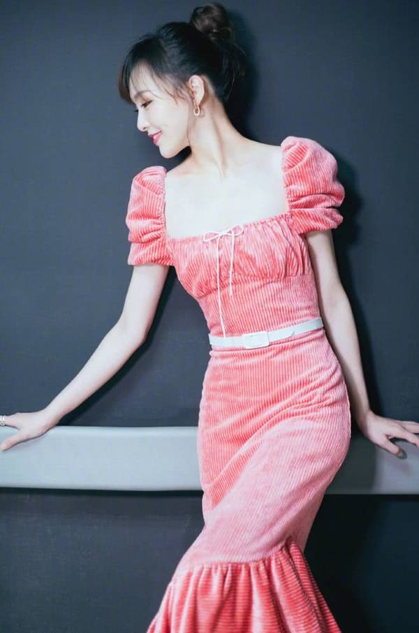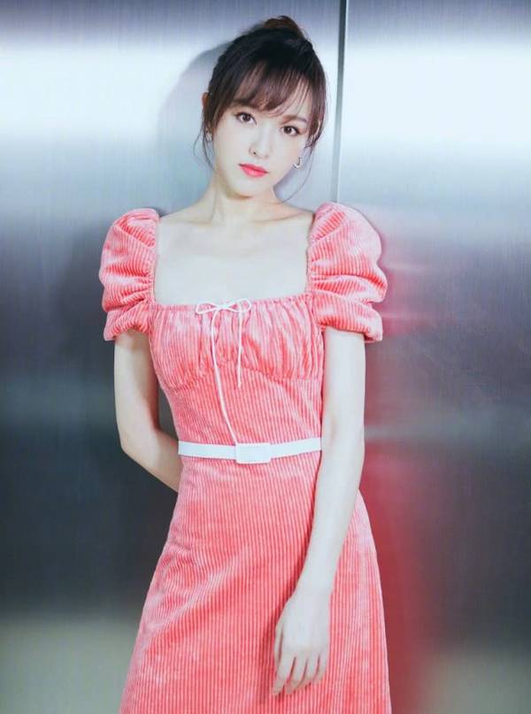 唐嫣身穿一件粉色灯芯绒连衣裙,个性独特的泡泡袖,尽显甜美少女气质,方形的领口设计,露出姣好的颈部曲线,手拿一个精美包包,简直美得不像话!
