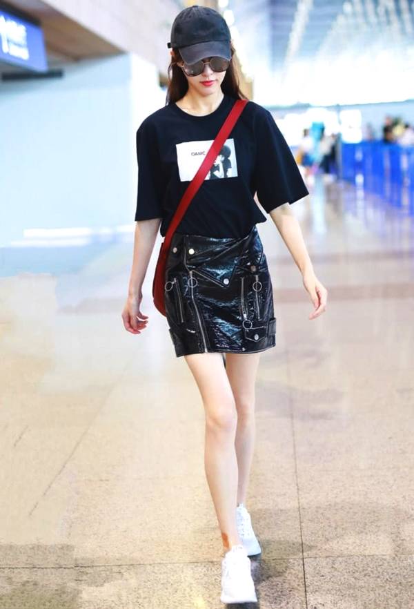 唐嫣身穿一件黑色印花T恤,简单的印花打破了黑色的枯燥感,搭配一条设计感十足的黑色漆皮短裙,将一双白皙美腿展露无遗,脚踩白色运动鞋,头戴黑色棒球帽,整体造型时髦到飞起!