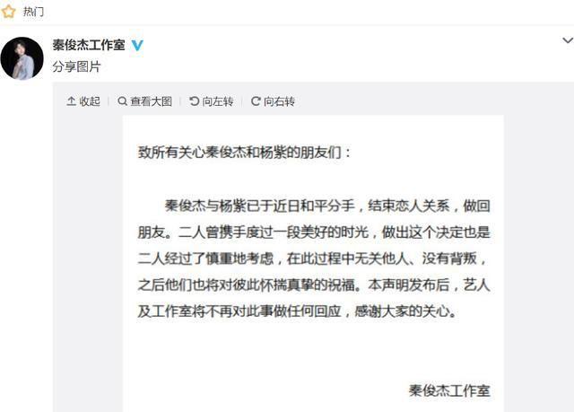 12日下午,秦俊杰工作室分享了一张图片,关于秦俊杰与杨紫和平分手的声明,结束恋人关系,做回朋友。这分手声明怎么和马思纯欧豪的有点像呢!