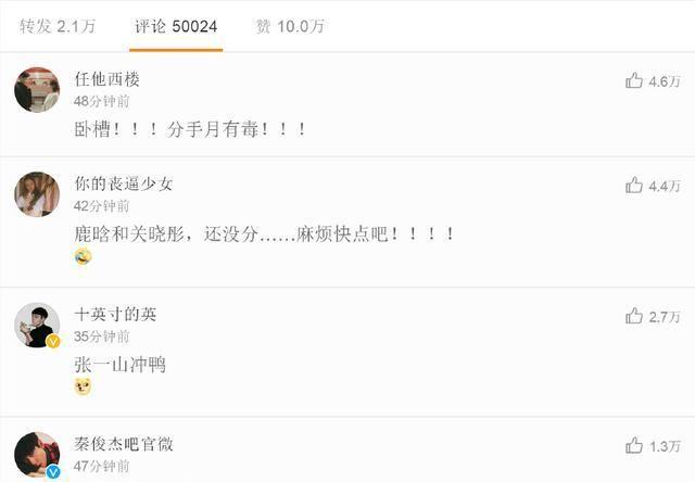分手声明发布后,网友评论炸了,“分手月有毒”,“鹿晗和关晓彤,还没分......麻烦快点吧!”,还有让张一山冲的,不知道杨紫分手了,被情所伤,张一山会怎么做。