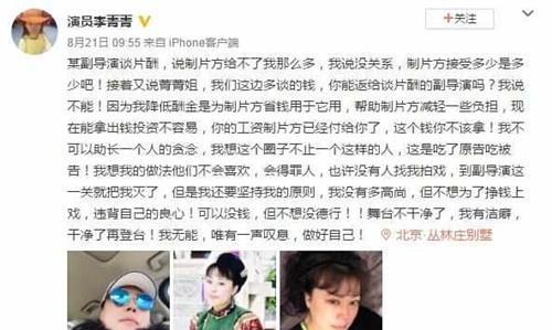 3个多月前,当时李菁菁就在网上爆料揭露了某副导演的丑陋行为,大概意思就是,假如李菁菁2000的片酬,副导演报给片方开价3000,多出的1000副导演想让李菁菁私下返给他,进副导演等人的腰包了,李菁菁毫不犹豫的拒绝并表示‘我不想为了能够演戏挣钱,违背自己的良心’。
