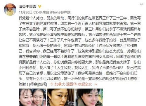 也因此爆料,李菁菁得罪了这位副导演,还引发近500名副导演喊话要集体封杀她,而她也没有因此低头,毅然选择了退出娱乐圈,放弃演戏,出走国外全身心的陪自己的女儿读书,并愤怒发声:“你们不用封杀我,我不演了,我情愿另谋出路,也不会向你们低头,没有什么不可以放弃的,唯一舍不得的是一直深爱我的观众和粉丝们”!