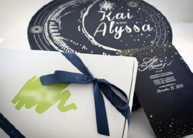 礼盒和卡片上的英文名“Kai & Alyssa's wedding”是小两口的英文名字,与礼盒和卡片同时公布的还有婚礼当日的DRESS CODE(在特定场合针对前来参与者的服装所制定的要求)主题为:白、灰、蓝、银(任意一种颜色即可)。小编已经能够想象,这样的DRESS CODE加上月光星辰的夜空蓝色调,整个婚礼的氛围将会充满浪漫。
