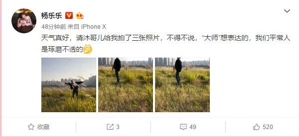 11月25日,杨乐乐晒了出游的照片,4岁小沐沐给妈妈拍了一组照片,在他视角下的妈妈被拍成了“大片”,妈妈模糊又可爱,重点把妈妈拍得又瘦又高,成了长腿美女,可是杨乐乐的头部不再儿子的拍摄范围内,这样的“大片”有多少人能欣赏得来呢?杨乐乐迫不及待地跟大家分享小沐沐的“大师”作品,直呼这样的艺术平常人琢磨不透,妈妈只有乐一乐。