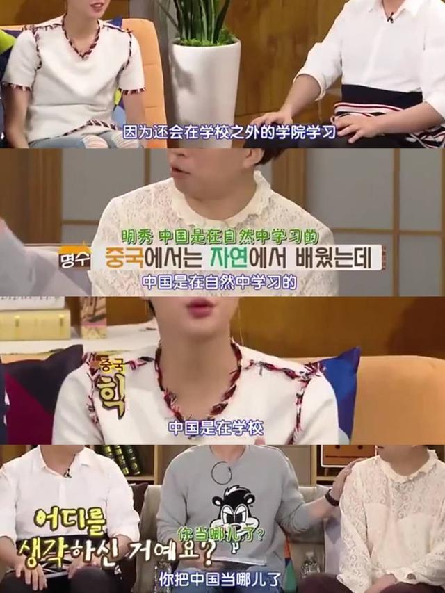 为了跟上进度,金高银说她自己只能去别的学院偷偷补课去了,当时的韩国嘉宾朴明秀开始暗讽中国没有学校,是在丛林里面学习的,是在自然中学习的,听到这话的时候我就想抽这个主持人,高金银当时的反应让我圈粉了。
