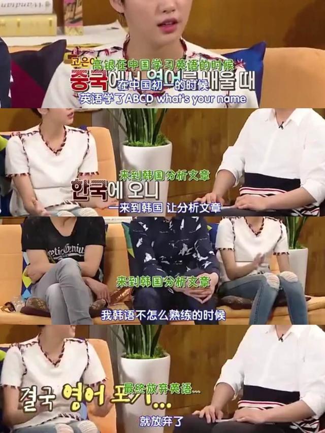 由于没有怎么接触韩文,所以在初一的时候,来到韩国的金高银让她分析一篇文章,可是韩文不怎么熟练的她就最终放弃了。