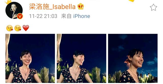 11月22日,梁洛施就在微博上晒出了自己的近照,上传了三张图片并配上两个爱你和一颗心的表情包,看上去梁洛施对于自己的近况非常满足。