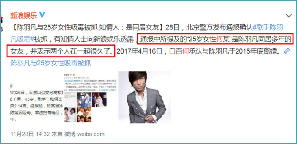 据媒体报道,与陈羽凡一同被捕的还有其25岁的女友,而且此女友已经与陈羽凡同剧多年。至于这个多年到底是几年,由于媒体并没有报道出来,因此还是一个小秘密,随后有人联系白百何与陈羽凡曾经曝出在2015年离婚,因此这个“多年”的时间段也貌似有了些范围。